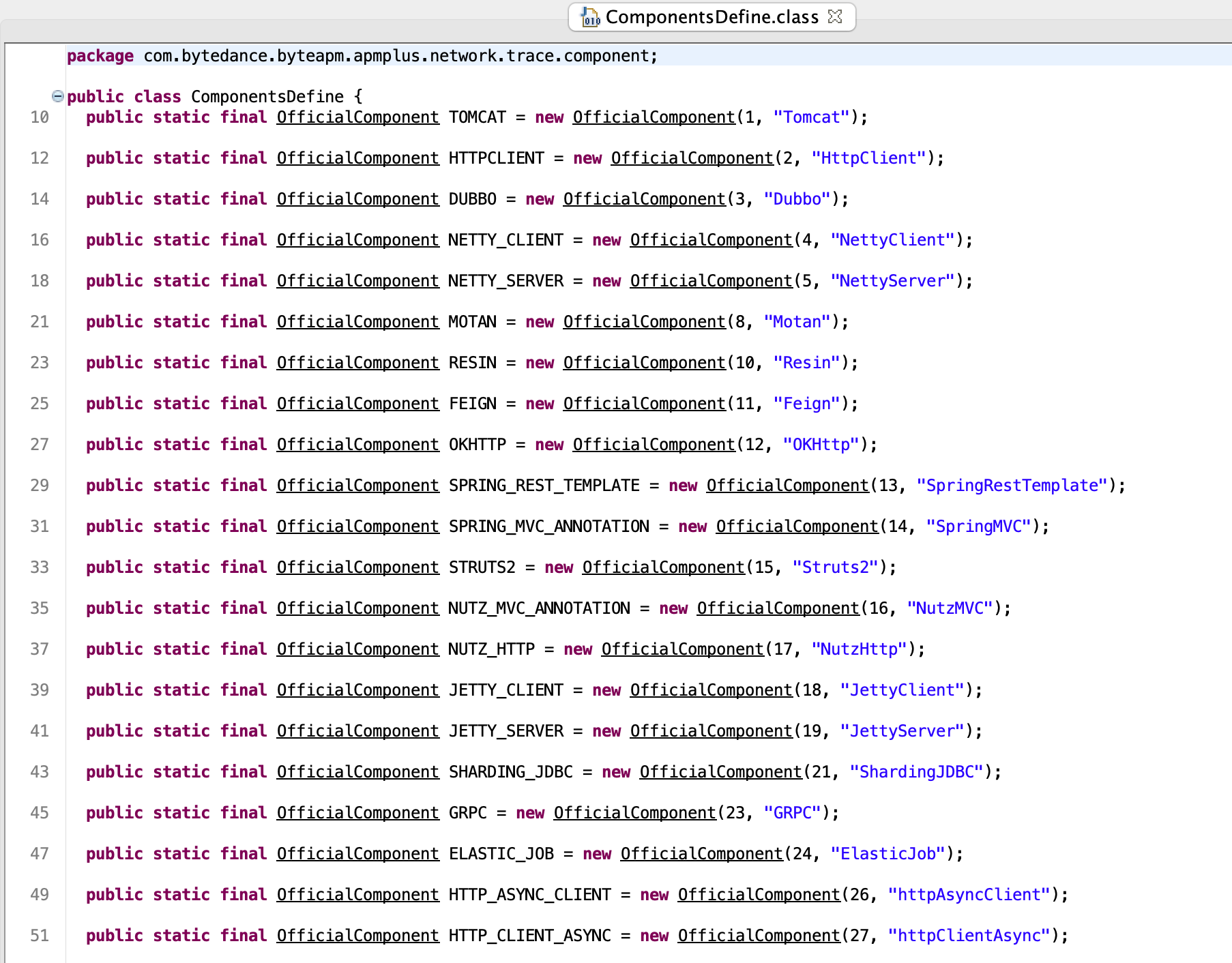 The ComponentsDefine class is unchanged, even with component ID and name. This is Volcengine’s version, and check SkyWalking’s version